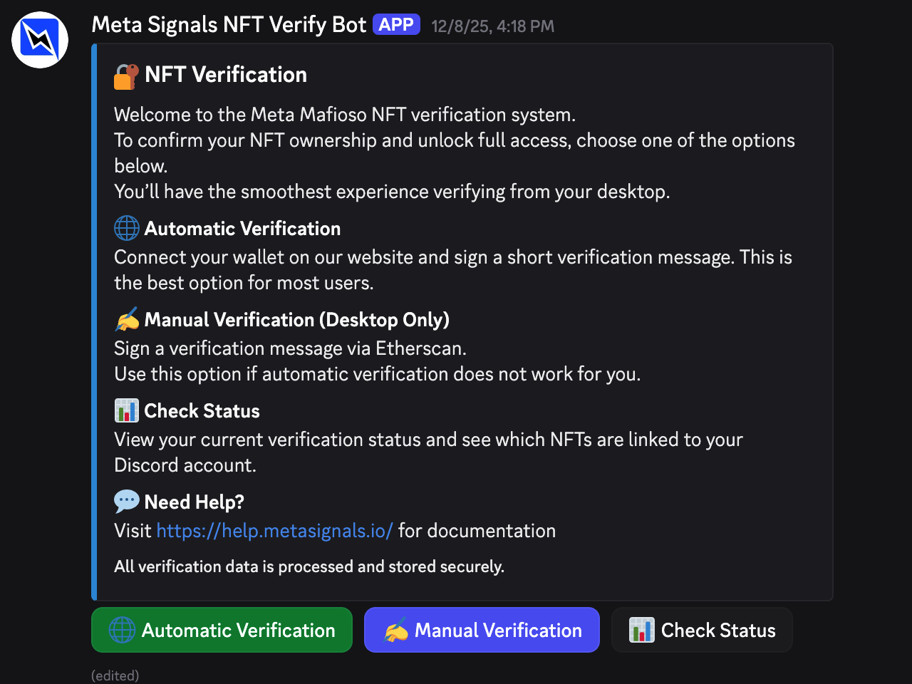 You will see the following message from the Meta Signals NFT Verify Bot: